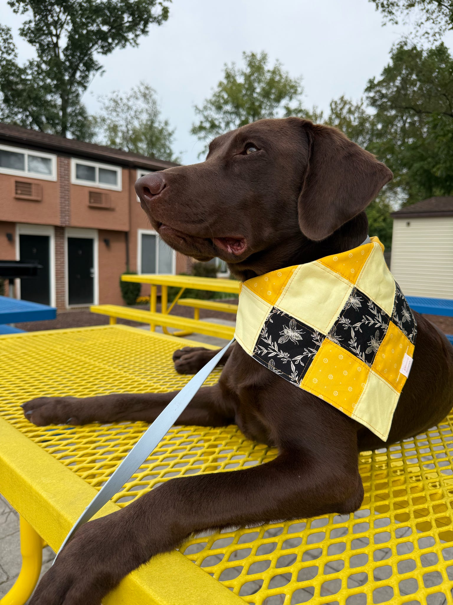 This bandana is sooooo very beautifully made. The colors pop! My puppers loves chasing bees so this fits perfectly!